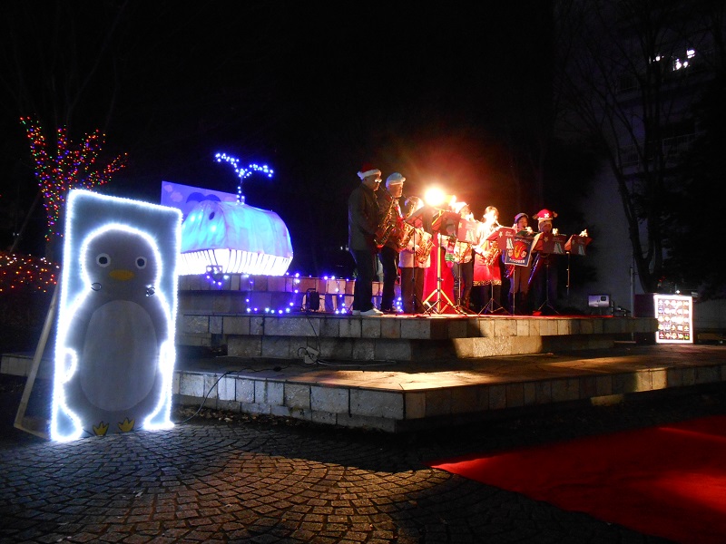 ちょっと見ると「インディアンの火祭り?」みたいに見えますが、それは照明のかがやきのため。野外での演奏は結構綺麗な音で響いている気がして、気分の良いものでした。「お祭り」としてはまだ寂しい感じでしたが、もっと演奏者が増えたりして盛り上がればいいなと思いました。