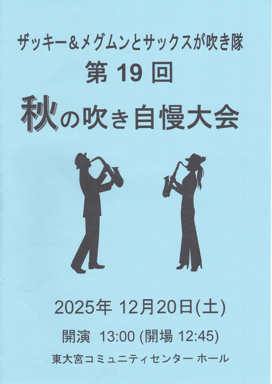 第19回秋の吹き自慢大会が12/20土曜日に東大宮コミセンで開催されるます