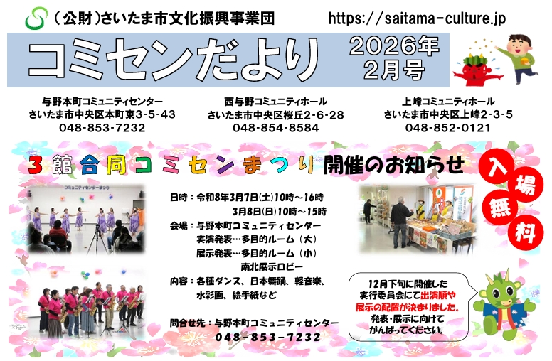 サックス隊は3月7日(土)3月8日(日)に与野本町コミュニティセンターで開催される3館合同コミセンまつりに参加します